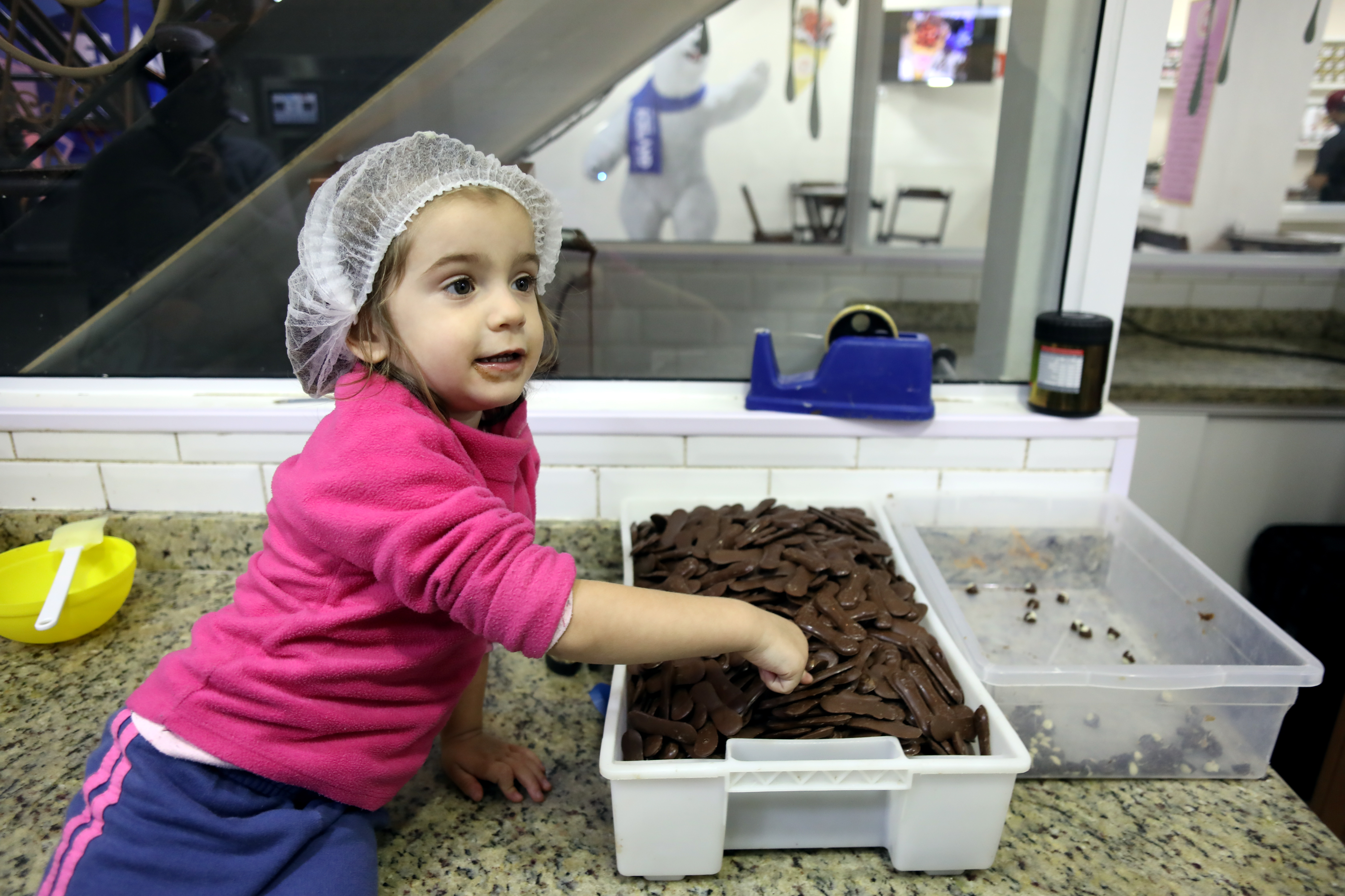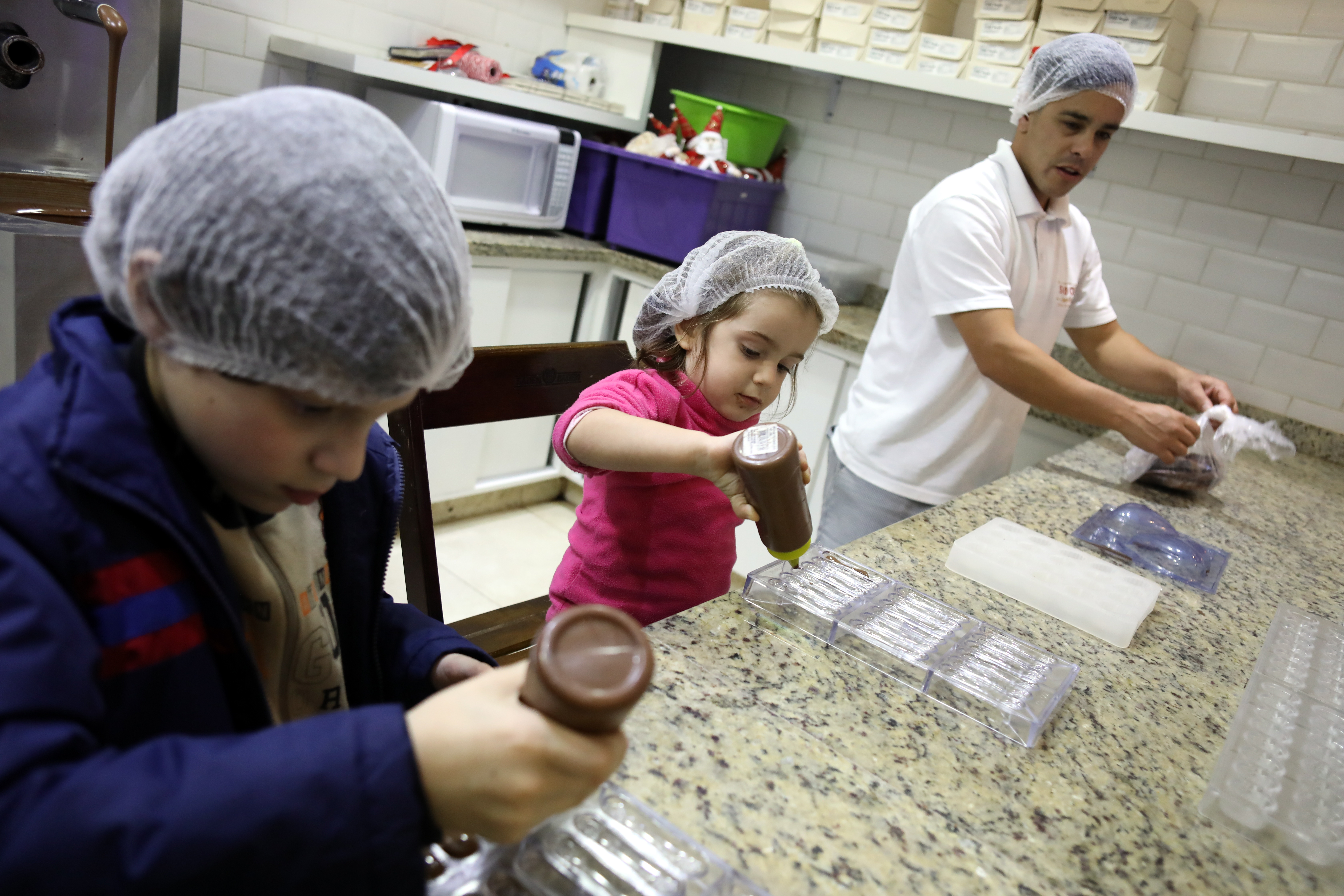 Maria foi acompanhada de Pedro Gonçalves, de 7 anos. Os dois ganharam toucas e foram botar as mãozinhas na massa, ou melhor, nas bisnagas de chocolate ao leite. A função foi preencher uma forminha de língua de gato cada um. Ao final, os chocolates foram desenformados e guardados em caixinhas que puderam levar embora, isso depois de degustarem vários enquanto trabalhavam ‘arduamente’. Essa experiência é um pouco ‘salgada’ para o bolso: sai por R$ 180,000, com direito ao chocolate, à touca e o avental.