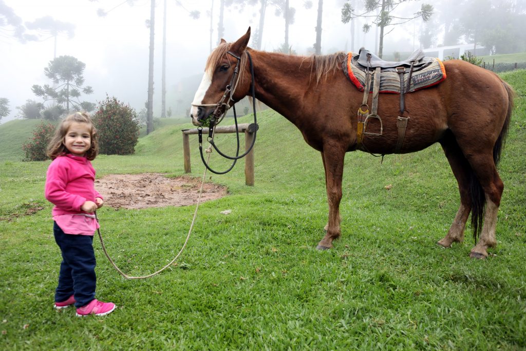 Apesar do frio de 12 graus e neblina por todos os lados, os exploradores mirins deixaram as dependências quentinhas do hotel para a aventura. Maria, que nunca tinha montado um cavalo, ficou sentadinha na sela como uma verdadeira amazonas.