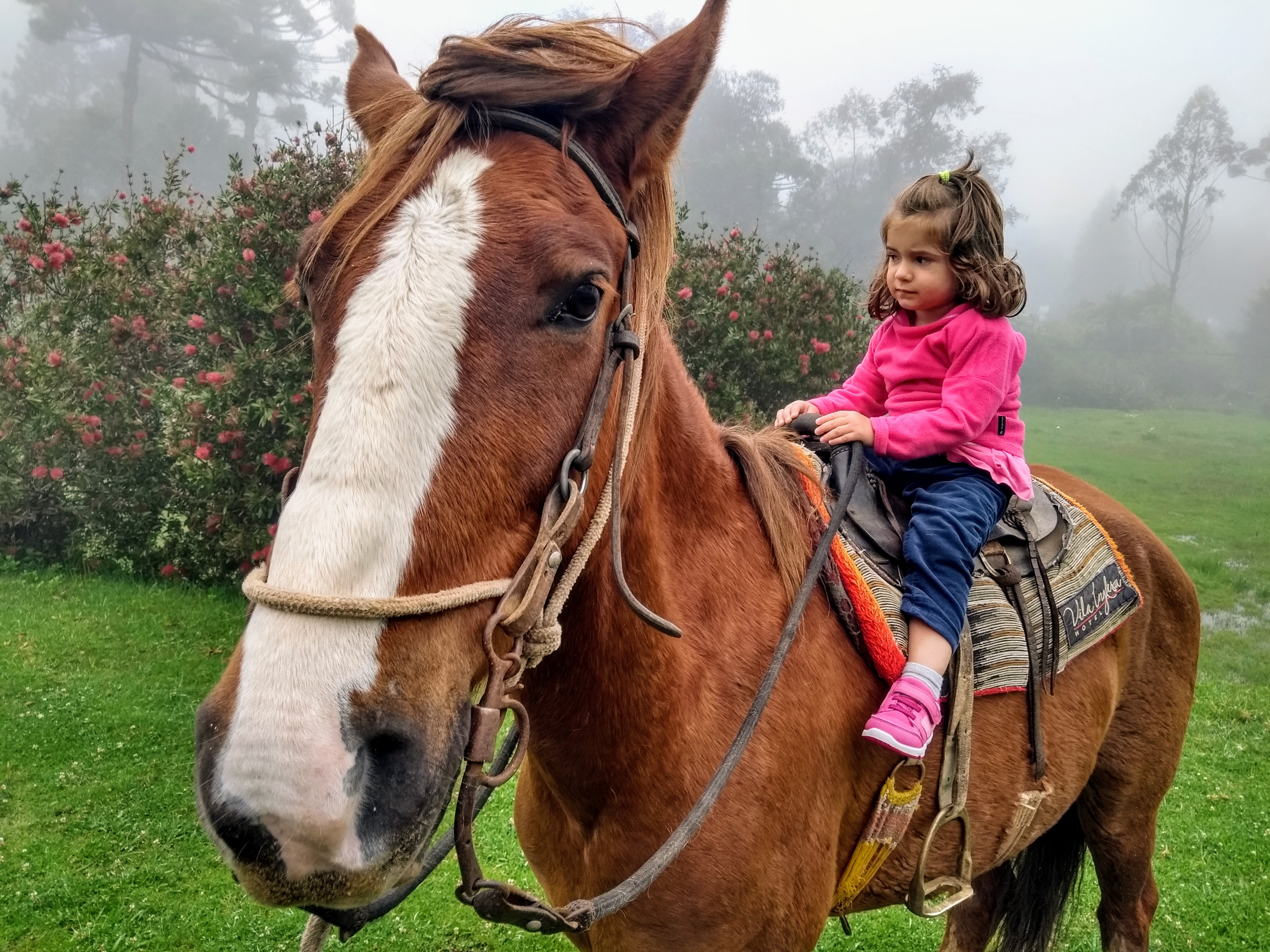 Apesar do frio de 12 graus e neblina por todos os lados, os exploradores mirins deixaram as dependências quentinhas do hotel para a aventura. Maria, que nunca tinha montado um cavalo, ficou sentadinha na sela como uma verdadeira amazonas.